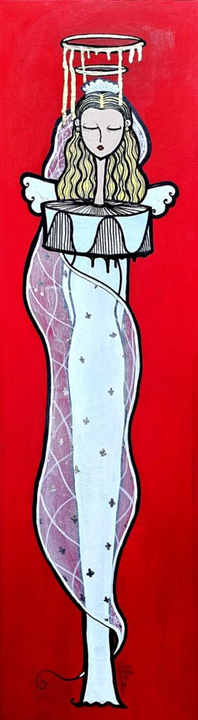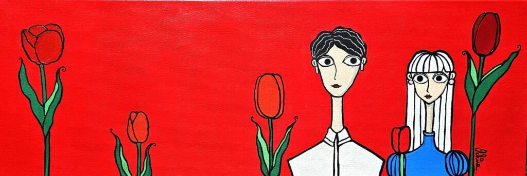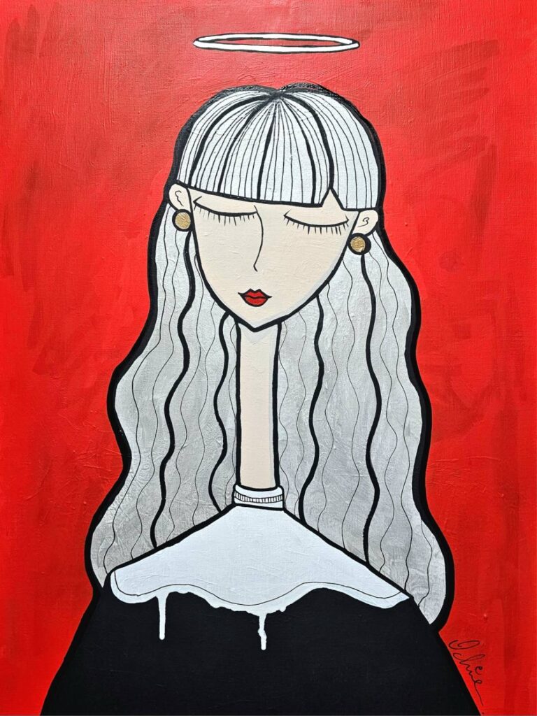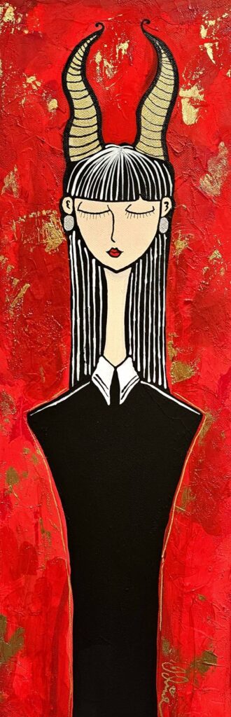 幼い頃日本へ来日した際、日本語を喋れず誰とも話せず、相手の感情を見るだけの無音の時期を経験した。 大人になり、現代社会で言いたいことも言えず表情を偽装して生きている人々を見て 、人の顔には見えない 心の奥の感情を描きたいと思うように。 感情を、炎を背景にのせて生きている絵を目指し、みてくれる人たちが対話できる作品を見せたいと思い描いている。